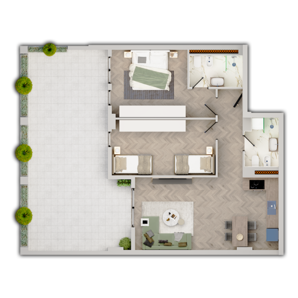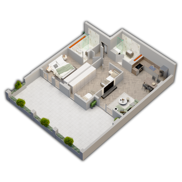 Apartament 2+1 në katin 0 të Godinës 4. Është i organizuar me një ambient gatimi/ndenje, dy dhoma gjumi, dy tualete dhe një verandë te bollshme me orientim nga Veri-Lindja.