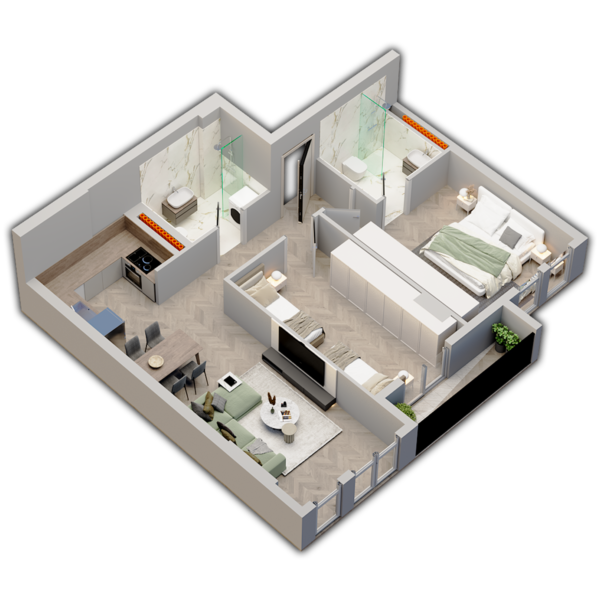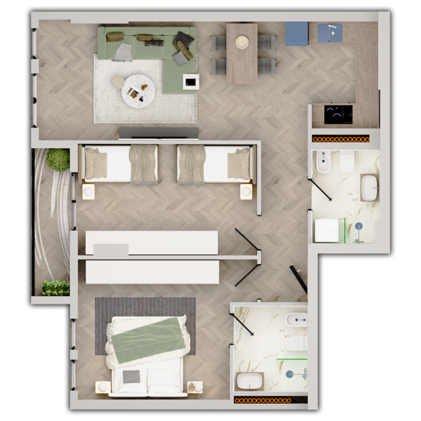 Apartament 2+1 në shitje, i mirëorganizuar dhe tepër komod. Apartamenti është me orientim Veri-Lindje, me dy dhoma gjumi të bollshme dhe një ambient dite.
