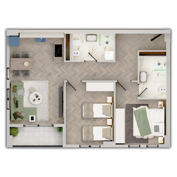 Apartament 2+1 për shitje në projektin Univers City. I organizuar nga dy dhoma gjumi, dy tualete dhe një ambient i përbashkët gatimi dhe ndenje. Me orientim nga Perëndimi, apartamenti ndodhet në katin e parë të Godinës 6.