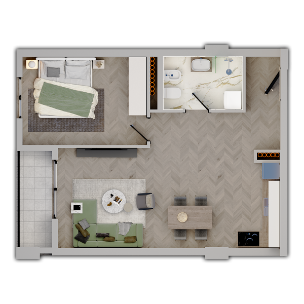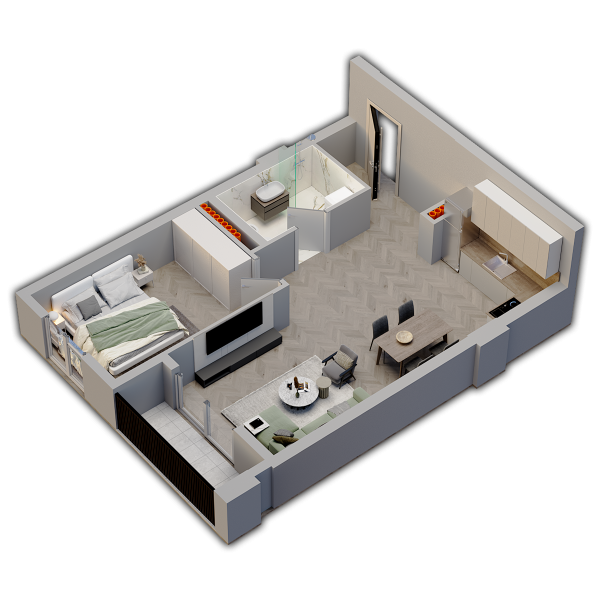 Apartamenti 1+1 për shitje tëk kompleksi Univers City. Apartamenti është i mirë-organziuar me një dhomë gjumi, një tualet dhe një ambient dite për gatim dhe ndenje