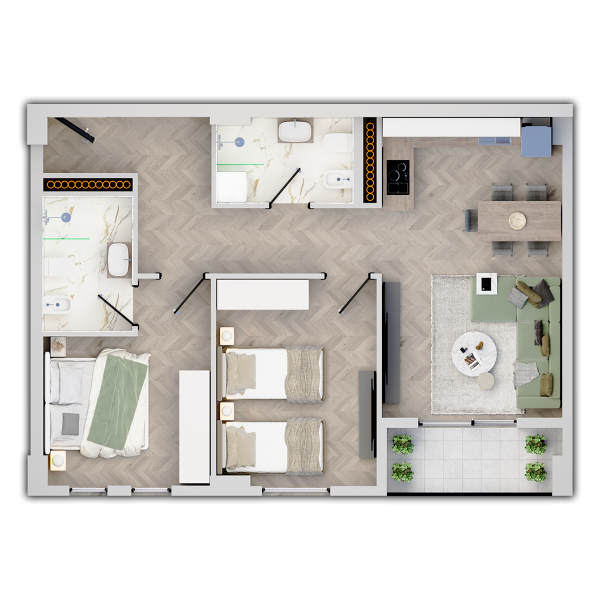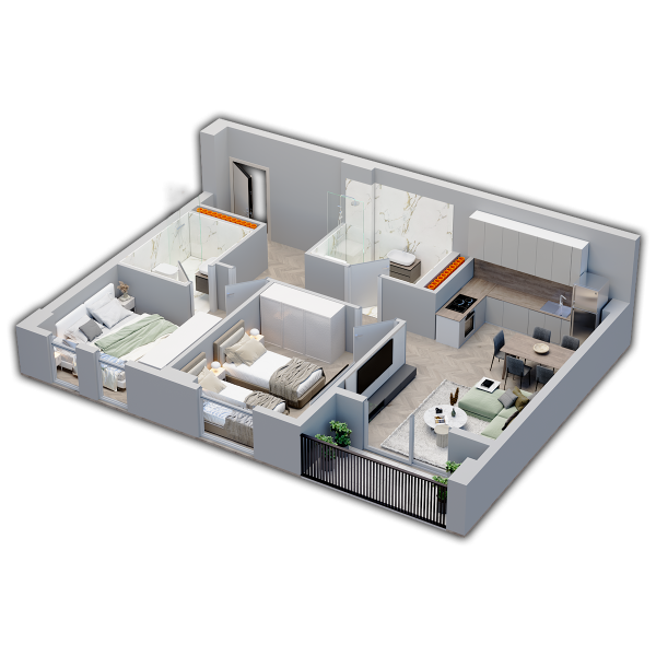 Apartament 2+1 tek Univers City. Një apartament i mirëorganizuar dhe më hapësira të mirëshfrytëzuara. Është i organizuar nga dy dhoma gjumi, dy tualete dhe një ambient i përbashkët për gatim/ndenje.